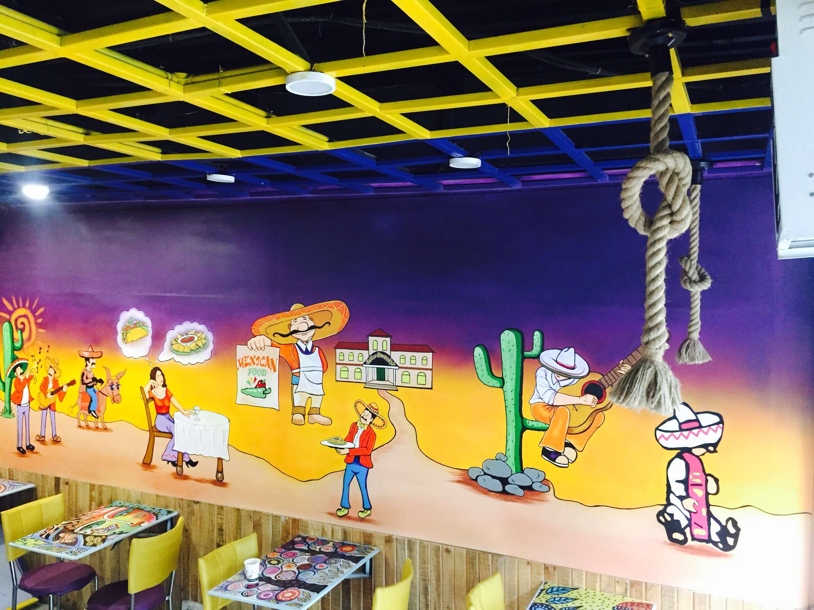 Colorful animated paintings on the wall of this café will give your mood a fun element which will cheer up your mind for the rest of your day. The painting will tell the audience a story about how you should be loving Mexican food. Mexican food is the specialty of the café. Apart from the painting, the rest of the décor is pretty bright and colorful too.
