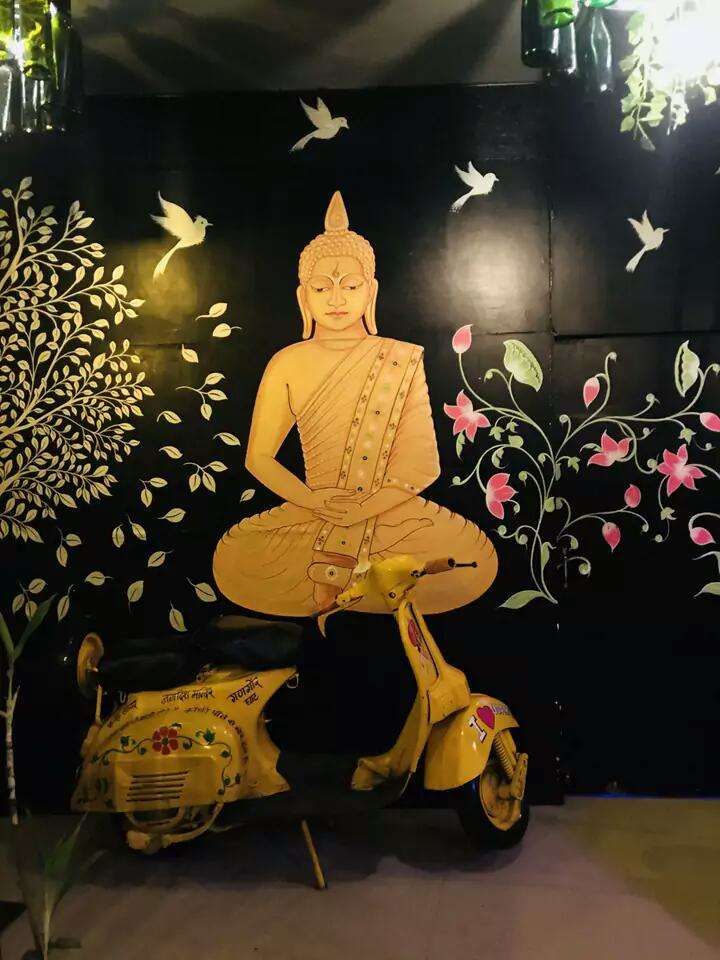 The retro and Rajasthani combined themed yellow scooter and the painting of peaceful Buddha right behind it will give you all the calm that you need while grabbing a quick bite at the café. Half of the people from Udaipur would have clicked a picture sitting on the scooter giving out all their funny and cool poses and the beautiful background just adds up to the charm of the picture.