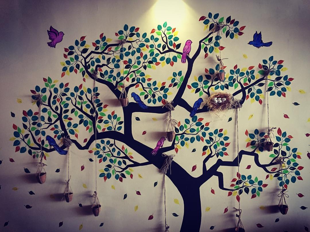 If you are a nature person and love getting clicked in front of a beautiful wall painting, go visit this place. It has a beautiful wall art with a tree and birds. It looks so realistic that you will think that you actually sitting between birds. The eggs in the nest (eggs made up of some marble) and pots are real so it will give you a 3D effect.