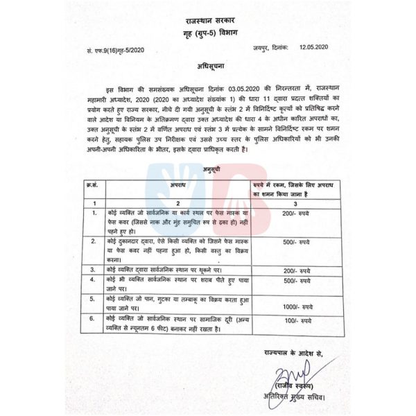 यदि कोई व्यक्ति सार्वजनिक स्थान पर सामाजिक दूरी (आस-पास के लोगों से न्यूनतम 6 फ़ीट दूरी) बनाकर नहीं रखता है तो उसे 100 रुपये का जुर्माने का दंड भुगतना होगा।