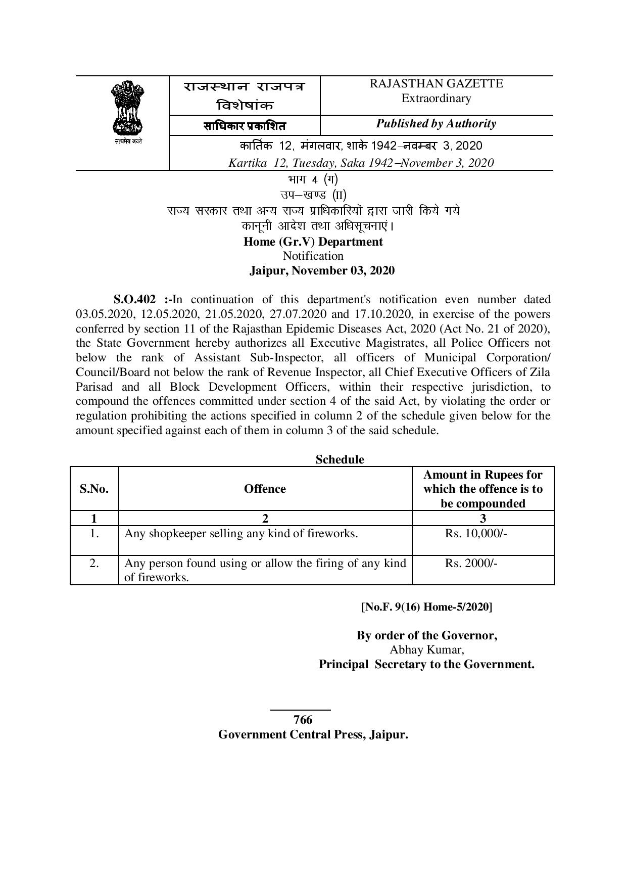 राजस्थान गृह विभाग ने राज्य में दीपावली पर पटाखे बेचने और आतिशबाज़ी करने पर जुर्माना घोषित कर दिया है। आदेशानुसार राज्य में पटाखे के बिक्री करने पर 10 हज़ार का जुर्माना लिए जायेगा और आतिशबाज़ी करने पर 2 हज़ार का जुर्माना लिया जायेगा। यह प्रतिबंध 31 दिसंबर 2020 तक लागू रहेगा।