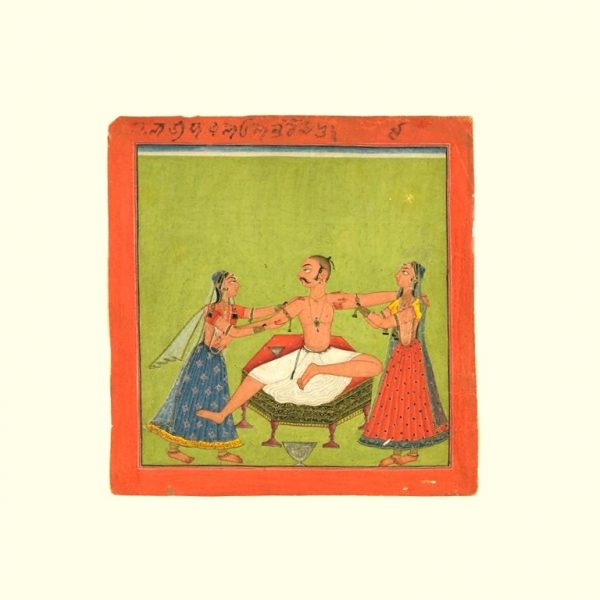The painting is taken from a Rajasthani school from J.C. French collection. On the back of the painting is inscribed a name ‘Son Singh’ but no king of this name is recorded. However, his features resemble a portrait of Amar Singh of Jailsamer.