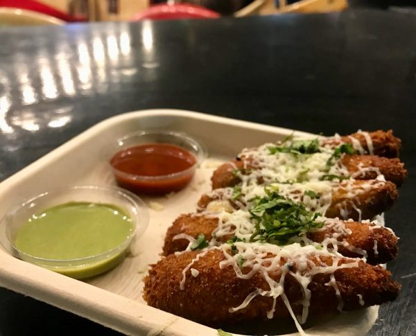 Don’t go on their simple looks, these inside-out cheese filled cigar rolls will give you a gastronomical experience that nothing else can give. These rolls are made from two simple ingredients gooey potato mix and liquid & shredded cheese. This irresistible snack is served with ketchup and green chutney.