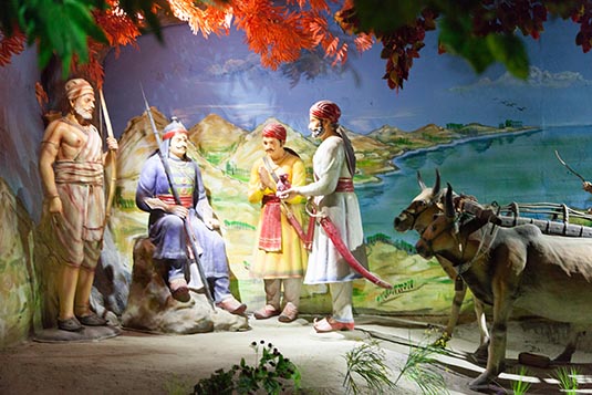The museum displays in the form of attractive models, pictures are tableau of the royal emblem of Mewar, the sacrifice of Panna Dhai, Mahara Pratap discussing his strategies with his ministers and chiefs, Pratap’s union with his horse Chetak, scenes of Pratap’s life in the jungle, eating bread made of grass, the vow taken by Gadia Lohars not to live in houses, scenes of Chittorgarh and other events related to Pratap’s life. The models some of which are made from fiber are operated by electricity and become lively by the accompanying music, sound and light effects. Also highlighted are those persons who were associated with the battle of Haldighati. Mansingh Jhala, Hakim Khan Soori, Ramshah Tanwar, Shalivahan Tansror, Pratap Singh Tanwar, Bhilu Rana Punja, Veer Pradhan Bhamashah, Veer Purohit Jagannath, Kalyan Podiyar, Mansingh Sajjawat (Delwarora), Tarachand Kavedia, Rana Sangha Chundawat, Bheemsingh Dodia, Ramdas Rathore, Mansingh Sonagora (Pali), Mahasahani Jagannath, Purohit Gopinath Rawal, Krishnadas Chundawat, Mehta Jaimalla, Barkat Jaisa Sauda, Barkat Kesav Sonda, Bhawani Singh Tanwar, Mehta Ratanchand Charan, Roma Sandhu, etc.