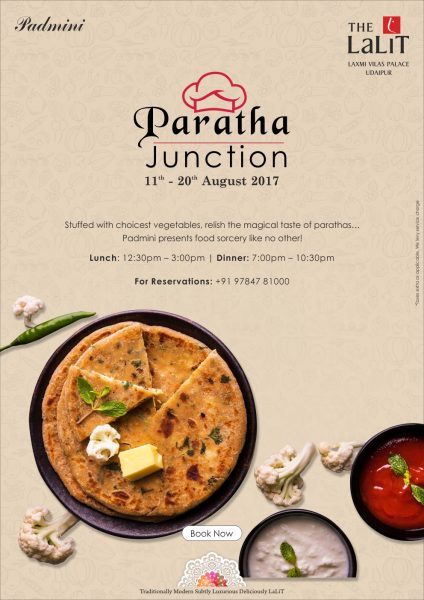 द ललित लक्ष्मी विलास, उदयपुर में 11-20 अगस्त तक फ़ूड फेस्टिवल चलेगा । इस दौरान लक्ष्मी विलास, उदयपुर आपके लिए लेकर आया है 10 तरह के पराठे । इस मानसून में अगर आप पराठा खाना चाहते है तो आपको कहीं इधर-उधर जाने की ज़रूरत नहीं है । इन 10 दिनों में आपको 10 अगल-अलग तरह के पराठो की वैरायटी मिलेगी वो भी रॉयल व्यू के साथ ।