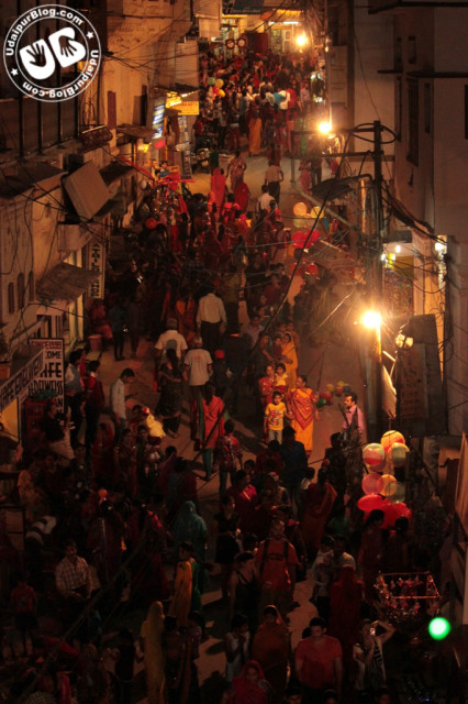The traditional Gangaur procession started Wednesday at 04.30 pm from Ghantaghar meandering its way through Jagdish Chowk, Bhattiyani chohhta, concluding at the spectacular Gangaur Ghat where the women of different local communities kept the idols of Gauri for further customs.