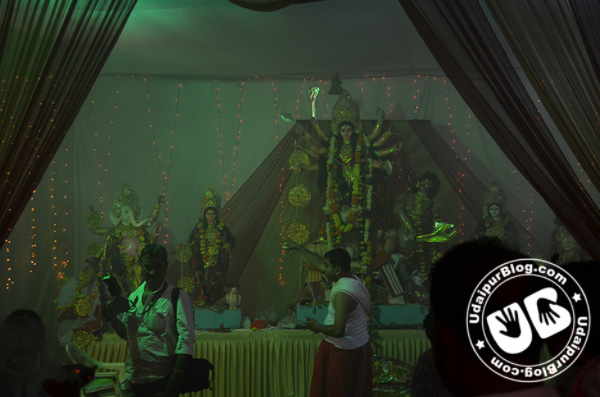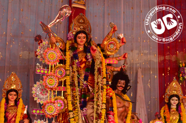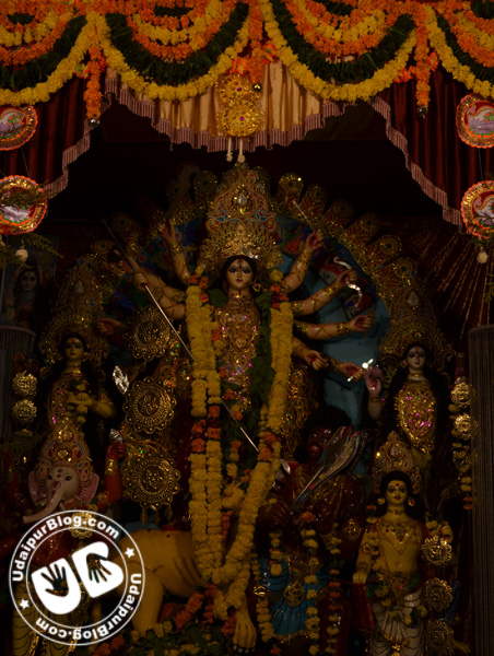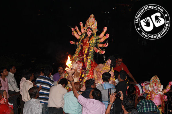 Like every other year, this year too, there were celebrations at different places in Udaipur. UdaipurBlog.com brings you pictures from the 4 day celebrations of Durga Puja that ended on Vijaya Dashmi. Beginning with the bodhan, to routine rituals, “pushpanjali”, “balidaan”, “sandhi-puja”, and the famous “Dhunichi” dance and Sindur Play, the celebration concluded with immersion of the deity idols into water bodies. For a detailed info on the traditions and how the idols are made ‘Eco Frendly’ as well as fit for immersion into water bodies, I suggest you to read the post below