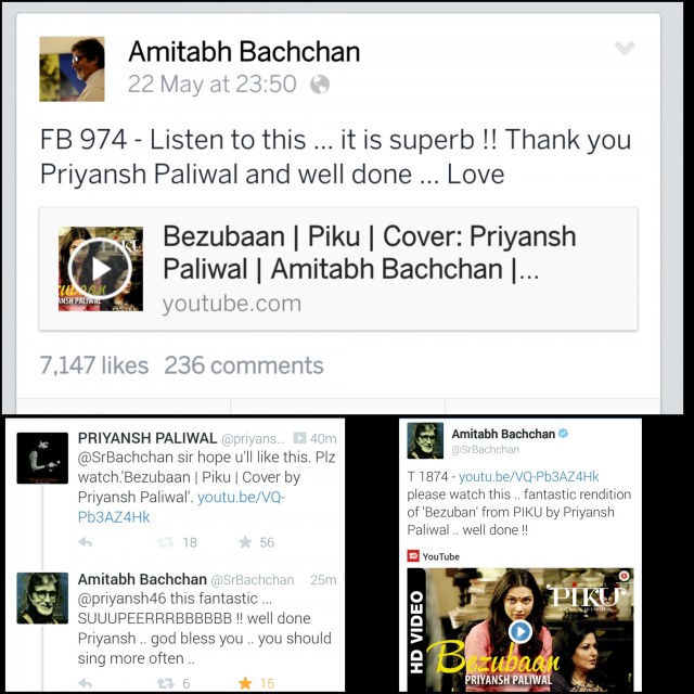 I count the cover of Bezubaan from the film Piku as one of my greatest achievements. After uploading the cover I had requested Shri Amitabh Bachchan Ji to watch the video. Although I was not sure that he would but, he watched it and shared it on his social profiles within next fifteen minutes. I am very grateful to receive such a humble response from one of the legendary Bollywood celebrity. Thereafter I received applauds from round the corners. I had been interviewed by various print and electronic media after the incident.