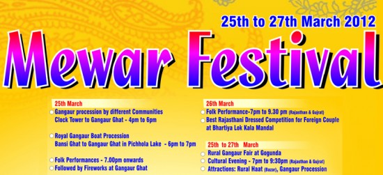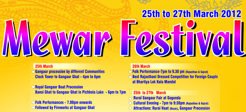 Mewar Festival in Udaipur is to be organised this year from 25th to 27th March, 2012. Here is the Schedule of the Mewar Festival which includes the timing Gangaur Procession which will be carried out everyday.
