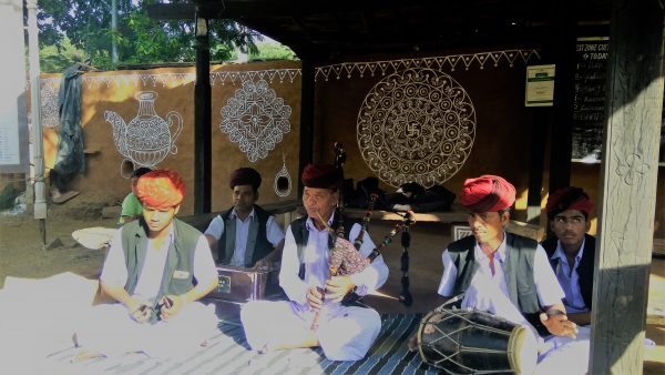 अच्छे से सजे गेट में एंटर होते आपको बड़े करीने से सजाया हुआ एक गाँव दिखाई पड़ेगा और सीधे हाथ की ओर आपको नागौर से आए सरवन कुमार एंड बैंड आपके स्वागत को तैयार रहेंगे। सरवन कुमार इस बैंड के मुखिया है और बड़े विनम्रता से आपसे बात करेंगे। उनसे हमने तकरीबन 20 मिनिट तक बात करी इस दौरान उन्होंने अपनी 2 बार प्रस्तुति भी दी। वो मशक बजाते है जो एक स्कॉटिश इंस्ट्रूमेंट है जिसे इंग्लिश में बेकपेपर कहा जाता है। राजस्थान सर्कार से सम्मानित हो चुके है। यहाँ उनके फोटो और एक परफॉरमेंस शेयर कर रहे है। इनकी ये परफॉरमेंस आपको सीधा नागौर ले जाएगी वो भी शिल्पग्राम बैठे-बैठे।