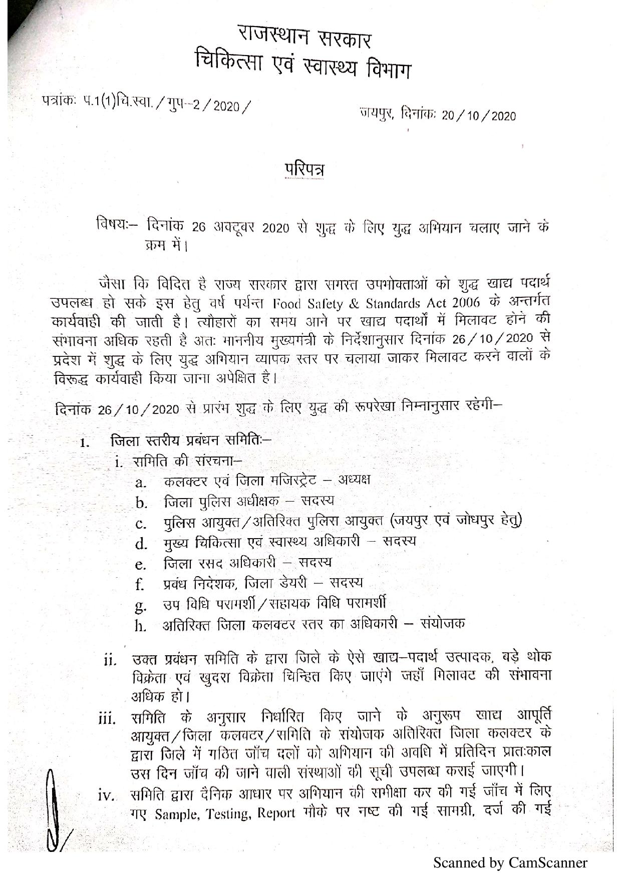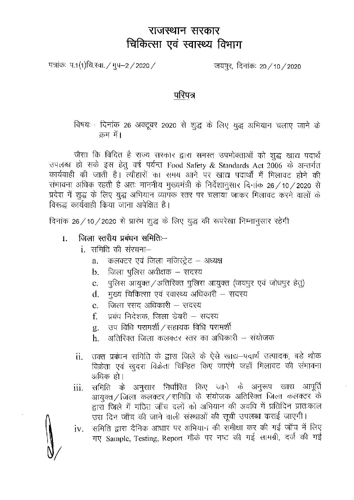 राज्य सरकार के आदेशानुसार जिला प्रशासन त्योहारों के चलते होने वाली मिलावट को रोकने के लिए शहर में ‘शुद्ध के लिए युद्ध’ अभियान चलाएगा। शहर में यह अभियान 26 अक्टूबर से 14 नवंबर तक व्यापक स्तर पर चलाया जाएगा।