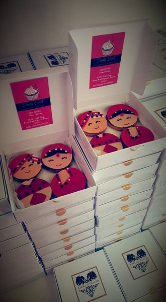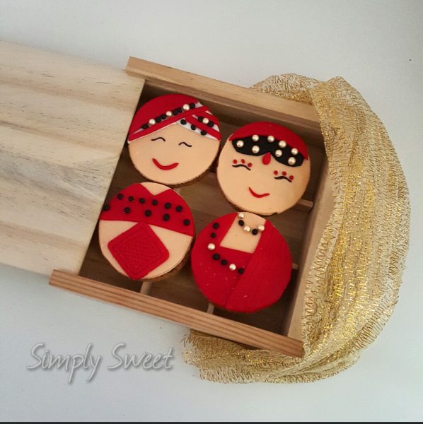 Below is one of her orders for a destination wedding. This included customized fondant cookies which represented the bride and groom and were kept in the wedding hampers in the hotel rooms for guests.