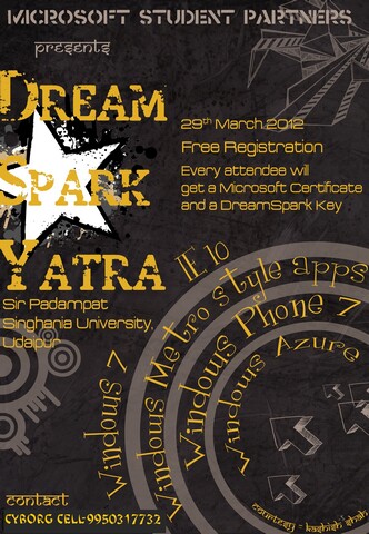 CYBORG, The Technical cell of Sir Padampat Singhania University, Udaipur is conducting an event “Microsoft DreamSpark Yatra 2012” on 29 March, 2012 in University Campus. The Speakers from Microsoft will be addressing around 800 Students on various topics associated with Windows technologies like – Windows Azure, Windows U-Crew, Kinect(Motion Sensing Input Device for Xbox-360) and their new Operating System – Windows 8.