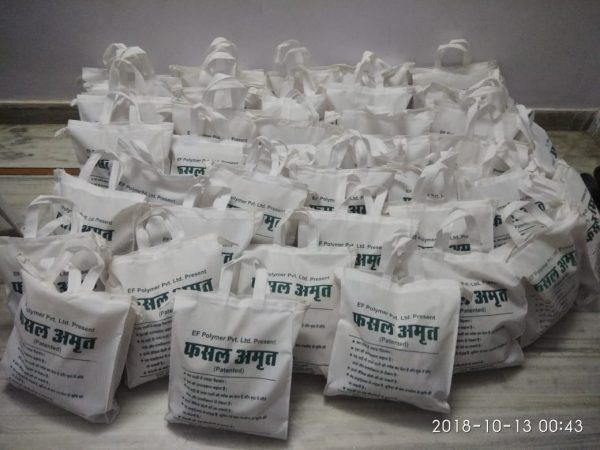 On testing of the product, the team found that it may retain water for 4 to 6 weeks that means crops irrigated at intervals of 2 to 4 days can now be irrigated up to 7 to 8 days with less water consumption. Finally, farmers can get more crop production in low water consumption.