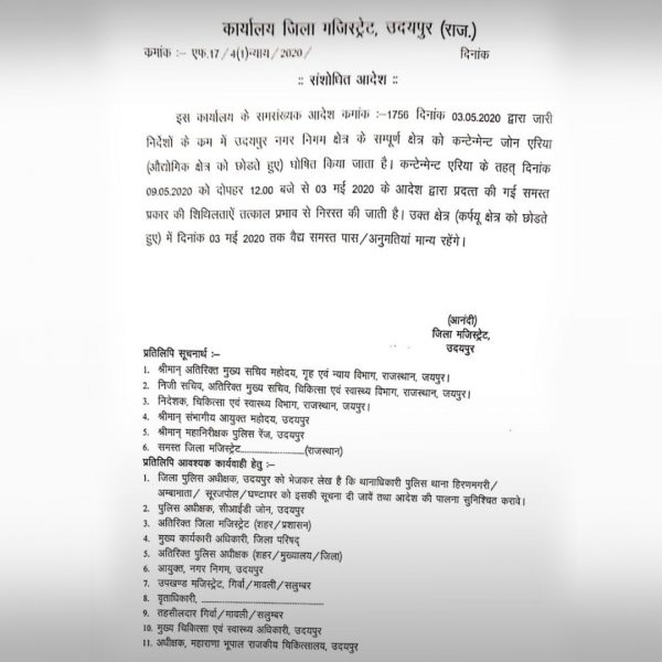 As per the order, Udaipur city will be treated as a containment zone from 12 pm on May 9. Meanwhile, all the will permissions and relaxation given to the people would be lifted back.