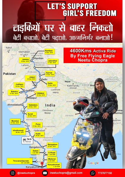 The 28-year-old FreeFlying Eagle, as she calls herself, left home on an Activa, on December 15, 2019, to travel solo all the way to Kashmir and then to Kanyakumari, the southern tip of mainland India. She covered a distance of more than 7,600 km across India in 42 days.
