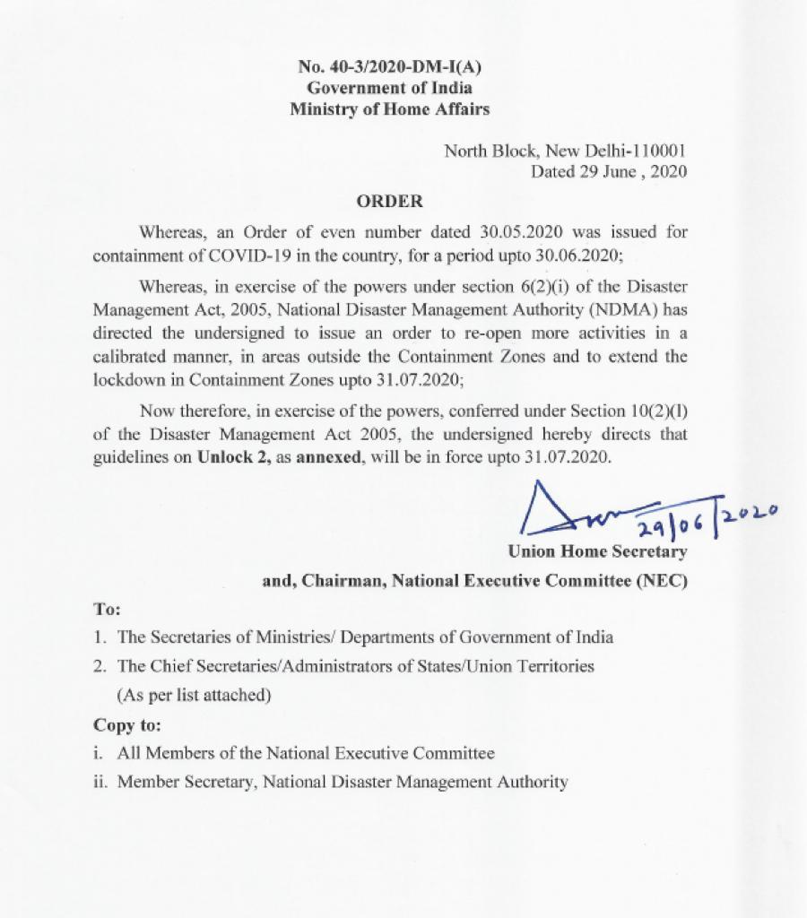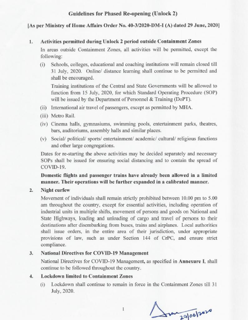 Unlock 2.0 will come into effect on July 1 and extend till the end of the month. The notification was issued a day before Unlock 1.0 guidelines were to expire.