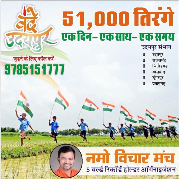 स्वतंत्रता दिवस भारत वर्ष में उत्साह, देशभक्ति एवं स्वाभिमान की भावना से मनाया जाता है। इसी भावना को और भी बलवती करने हेतु ‘वन्दे उदयपुर’ – एक पहल जिसके अंतर्गत उदयपुर संभाग के 51,000 घरों में तिरंगा फहराने का लक्ष्य रखा गया है। नमो विचार मंच द्वारा इस पहल का नेतृत्व प्रवीण रतलिया ने किया है।