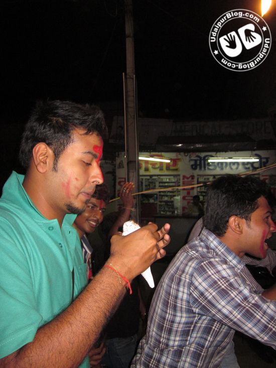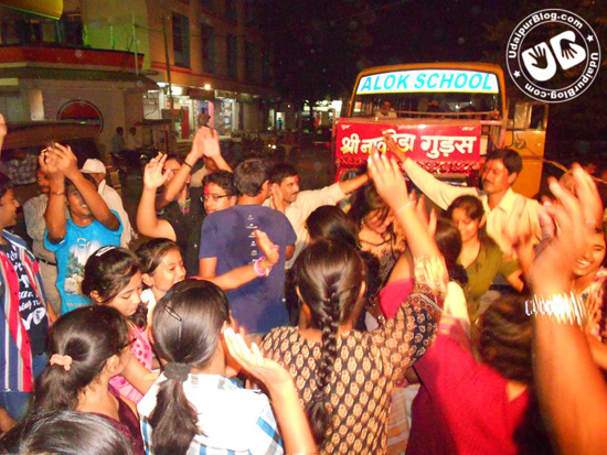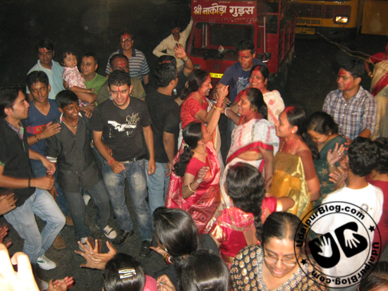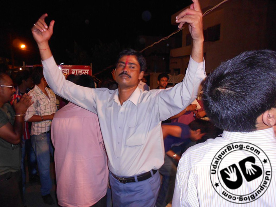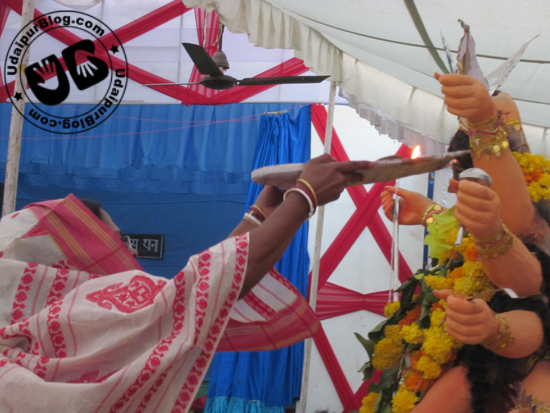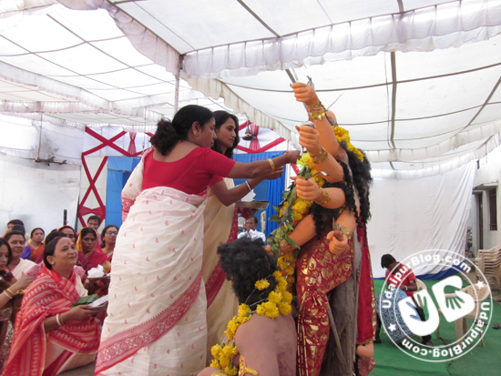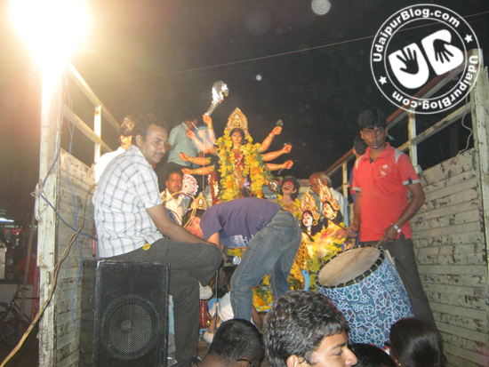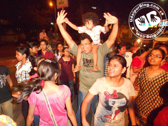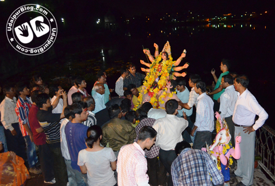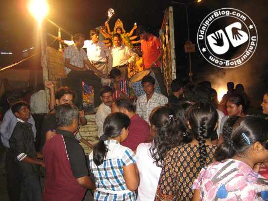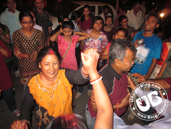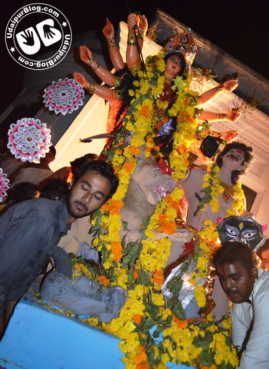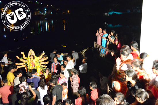 This year, I became a part of the Vijaya Dashmi celebration at Bengali Kalibadi Society, Hiran Magri Sec. 4. I could see crowd gathering and everyone preparing for the farewell to the Goddess.Women were beautifully dressed in traditional white Sarees with red borders. The ceremony was started by a ritual called Darpan Visarjan, followed by Sindur Khela, a ceremony only for women where they worship Goddess Durga, and then play with Sindoor. After that, the idols were loaded onto a truck, and the entire procession followed shouting slogans, with Dhols, Nagaadas, and huge amount of fireworks. Slowly and slowly the procession reached Swaroop Sagar, where keeping in mind the eco-friendly tradition, the non-biodegradable/plastic items were stripped off the idols, and with full devotion the deity was immersed into water, with an invitation to shower the blessings on us and come again in the next year.