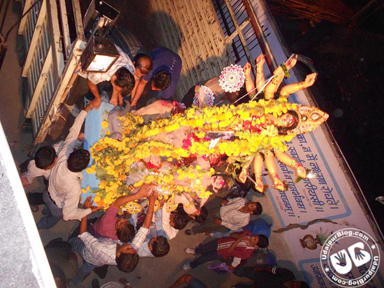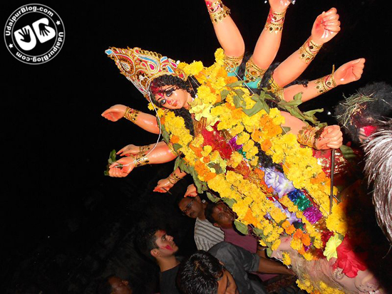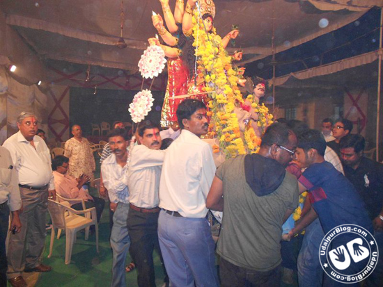 It is believed that during Navratri, Goddess Durga and her kids visit us, at her home, or Maayka from her in-law home place (Sasural), and goes back from our world to her Sasural on the 10th day. Hence on the 10th day, the procession is similar to any farewell celebrations which happen after all marriages. After the deity is immersed, people wish each other with the greetings of Vijaya Dashmi, and return to their homes.