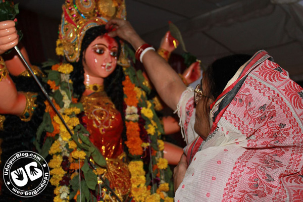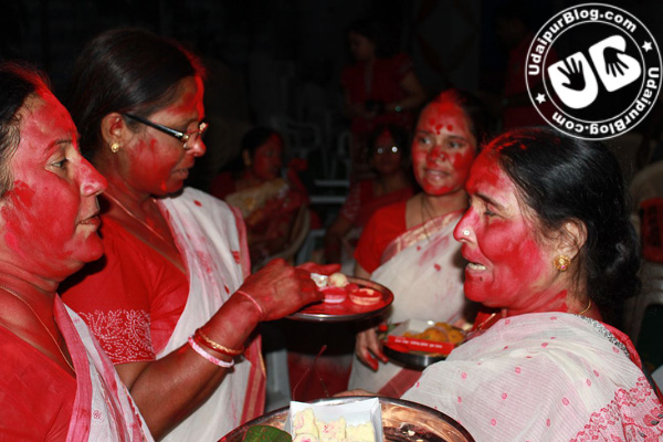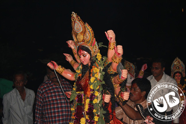 Like every other year, this year too, there were celebrations at different places in Udaipur. UdaipurBlog.com brings you pictures from the 4 day celebrations of Durga Puja that ended on Vijaya Dashmi. Beginning with the bodhan, to routine rituals, “pushpanjali”, “balidaan”, “sandhi-puja”, and the famous “Dhunichi” dance and Sindur Play, the celebration concluded with immersion of the deity idols into water bodies. For a detailed info on the traditions and how the idols are made ‘Eco Frendly’ as well as fit for immersion into water bodies, I suggest you to read the post below
