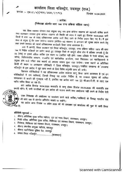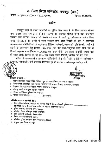 प्रधानमंत्री द्वारा देश में चल रहे लॉकडाउन की अवधि बढ़ाने के बाद उदयपुर जिला कलेक्टर ने विडीओ के ज़रिए आदेश जारी किए।