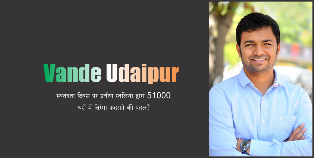 स्वतंत्रता दिवस भारत वर्ष में उत्साह, देशभक्ति एवं स्वाभिमान की भावना से मनाया जाता है। इसी भावना को और भी बलवती करने हेतु ‘वन्दे उदयपुर’ – एक पहल जिसके अंतर्गत उदयपुर संभाग के 51,000 घरों में तिरंगा फहराने का लक्ष्य रखा गया है। नमो विचार मंच द्वारा इस पहल का नेतृत्व प्रवीण रतलिया ने किया है।
