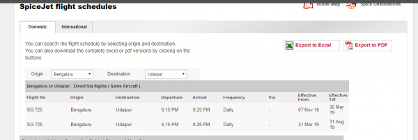- Flight SG725 will fly from Bangalore at 6:15 pm and reach Udaipur at 8:25 pm